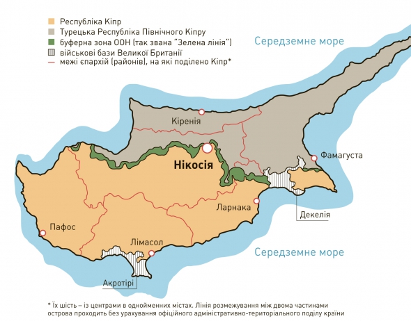 3,7% Кіпру – буферна зона під контролем військового контингенту ООН – так звана Зелена лінія, що розділяє острів на два сектори. 2,7% території займають дві британські військові бази, розташовані там від проголошення незалежності. Решта 57,6% – Республіка Кіпр. 2004-го вона стала членом ЄС. Входить до зони євро. У ТРПК в обігу турецька ліра. Економіка Північного Кіпру сильно залежить від Анкари. Останній пакет допомоги на 2013–2015 роки сягне понад $12 млрд. ВВП на душу населення у ТРПК становить $16,2 тис., у Республіці Кіпр – $26,4 тис.