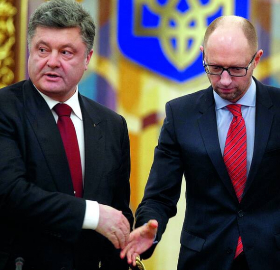 Президент Петро Порошенко й прем’єр-міністр Арсеній Яценюк під час засідання Ради національної безпеки та оборони, 20 грудня 2014 року. Президент анонсував 2015-го три етапи часткової мобілізації до Збройних сил. На півтора року призиватимуть чоловіків у віці 20–27 років. Також Порошенко наголосив на збільшенні витрат на армію до п'яти відсотків ВВП