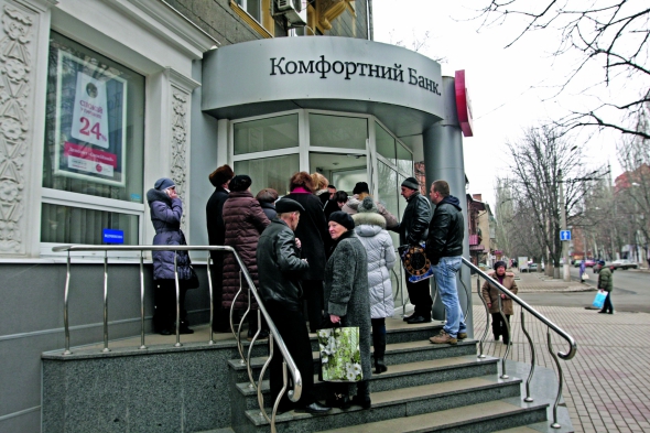 Біля банкоматів скрізь стоять чималі черги, буває, і по 20 людей. Більшість – з окупованих територій. Приїздять до Артемівська зняти готівку з карток.