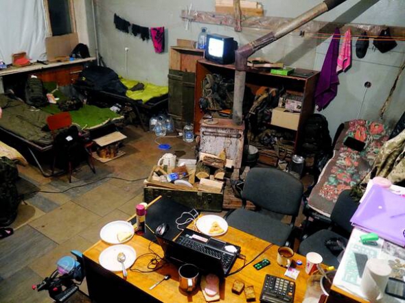 Веде на третій поверх. Казарми солдатів облаштували в колишніх офісах. Під стінами – лежанки, посередині стоять буржуйки. Працюють телевізори, є мережа Wi-Fi.