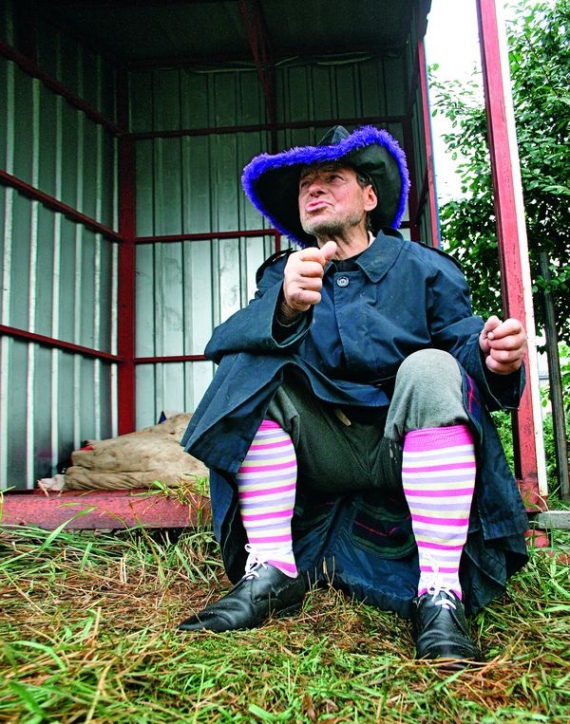– Узяв на секонді туфлі. Файні, англійські, – піднімає поли плаща.На ногах чорні носаті мешти з білими довгими шнурівками, зав'язаними абияк. Сірі спортивні штани заправлені в рожеві смугасті гетри.