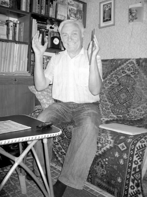 Запрошує до кімнати. На столі стоїть старий комп"ютер, поряд — холодильник і полиці, заставлені науковою літературою. Над дверима — дерев"яний хрест.