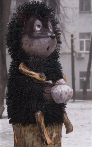 — Мені їжак більше подобається, ніж ота бронзова коняка, — каже менеджер 28-річний Сергій Сашко, який працює поряд. — Особливо його торбинка. У ній, мабуть, гречка й олія від Черновецького.