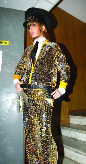 — Не мав часу зробити кращий макіяж. Змучився від переїзду. Після репетиції приліг в готелі на півгодини, а проспав дві. Коли проснувся, до концерту лишилось півгодини. А так по 3 години малююсь біля дзеркала. Мене всі копіюють. Сьогодні одів фуражку, завтра півкраїни буде таку носити. Одягну стрінги, всі за мною повторять. Бачу, почали носити бльостки. А я собі їх скрізь понашивав, щоб висміяти людей, які люблять усе блискуче.