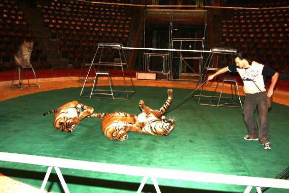 — Тримаємо шість тигрів, чотирьох левів і двох леопардів, — розказує директор цирку Володимир Шевченко, 61 рік. Він підходить до тигра і гарчить. Той показує великі зуби, гарчить тихо.