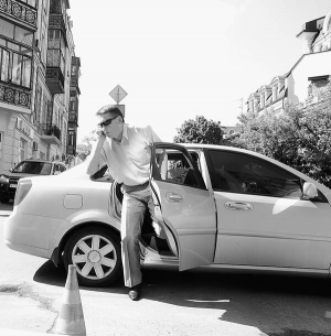 Мельниченко виходить зі сріблястого "Шевроле Лачетті". Його супроводжує водій та двоє охоронців. Екс-майор на ходу розмовляє по телефону. Він у сірих брюках, світлій сорочці й темних окулярах. У нагрудній кишені просвічує складені навпіл купюри 100 та 200 грн. Підходить до групи журналістів.