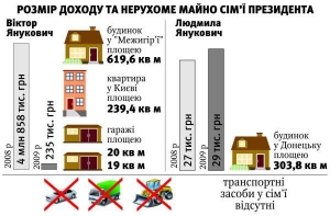 Президент 59-річний Віктор Янукович оприлюднив декларацію про доходи. 2009-го він отримав 190 тис. грн зарплати, 37 тис. грн матеріальної допомоги та 7 тис. грн дивідендів, процентів та роялті. Сплатив 6 тис. грн за договорами найму (оренди) та витратив 63 тис. грн на утримання майна.