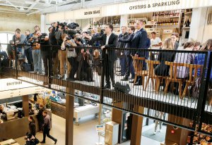 10 жовтня прийшов до "Київ фудмаркет" (це павільйон на 2 тис. кв. м у колишній будівлі заводу "Арсенал". Відкрився у вересні. У ньому працюють 22 ресторани. — ГПУ) на вул. Московській. Тут триває прес-марафон президента 41-річного Володимира Зеленського.