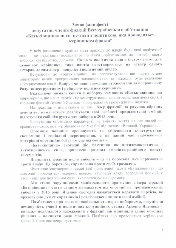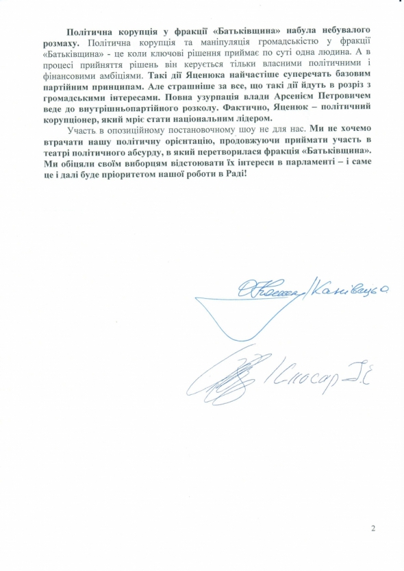 Разом зі своїм колегою Ігорем Скосарем вони також оприлюднили заяву-маніфест, у якій критикують лідера фракції "Батьківщина" Арсенія Яценюка.