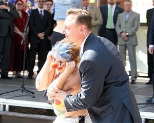 Правоохоронці ввічливо, але наполегливо повели активісток з-під сцени, після чого офіційного гості продовжили свій виступ.