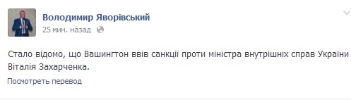 Народний депутат України Володимир Яворівський на своїй сторінці у Фейсбуці повідомив, що проти міністра внутрішніх справ Віталія Захарченка США ввели санкції.