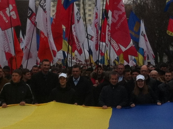 Марш на чолі з лідерами опозиції Олегом Тягнибоком, Арсенієм Яценюком та Віталієм Кличком пройшов із Київського до Театрального майдану, повідомили у "Свободі".