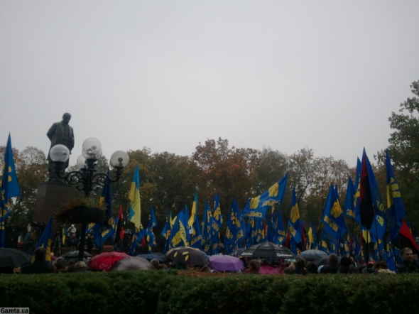 Біля пам'ятника Тарасу Шевченку в Києві зібралося близько тисячі людей. Вони тримають прапори й символіку ВО "Свобода" та червоно-чорні стяги.