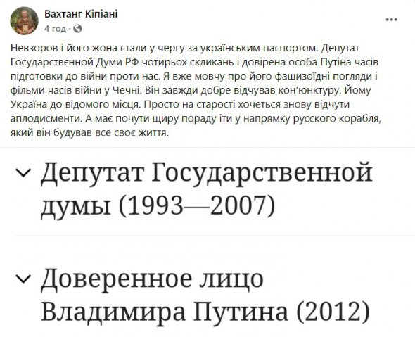 "Колись Антон Геращенко і Ко працевлаштували в МВС Іллю Киву. Нині цей самий Геращенко роздає паспорти рашисту Невзорову. З того, як він щиро радіє цій новині - це була його ідея. Ілля Кива виявився гнилим колаборантом. Щодо Невзорова - я тут чекаю повторення кейсу Сергацкова 2.0. От прямо секундомір вмикаю, де воно зламається остаточно (укрАінцамі він нас називає давно) і потягне сюди російських дружків. Це ж було вже не раз і не двічі - ще і знайдуться довбограї, які будуть це оплачувати за наші податки", - журналістка Марина Данилюк-Єрмолаєва.
