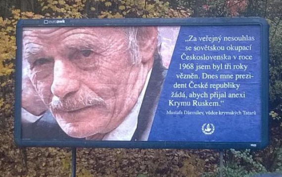 "За висловлення незгоди з радянською окупацією Чехословаччини в 1968 році я відсидів у в'язниці три роки. Зараз президент Чехії закликає змиритися з анексією Криму", - свідчить напис на білбордах.