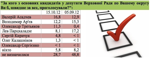 Соціологічне дослідження проводилось Асоціацією муніципального розвитку (Інформаційний звіт № 7) на території 218 округу м. Києва 13.10-15.10.2012 р. застосовувався метод квотної вибірки при анонімному анкетуванні. Допустима похибка 2% при 90%-му рiвнi довіри за Стьюдентом. Всі результати подано в %.