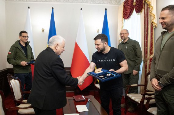 На знак подяки від імені українського народу Зеленський вручив Моравецькому і Качинському державні нагороди за допомогу Україні в захисті незалежності й територіальної цілісності під час російського вторгнення.