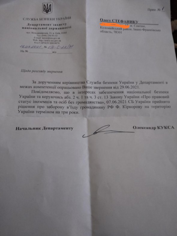 За словами блогера, 29 червня він написав на електронну пошту СБУ листа з вимогою негайно додати Кіркорова до чорного списку.