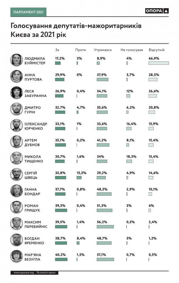 Буймістер пропустила 3 808 голосувань або 66,9%. Найбільш дисциплінованою виявилася Безугла, відсутня під час лише 32 голосувань - 0,5%.