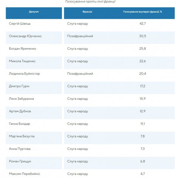 На другому місці - Юрченко, голосував проти фракції у 30,5%.