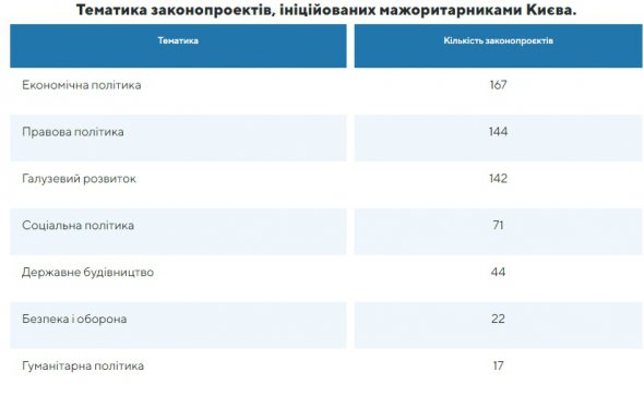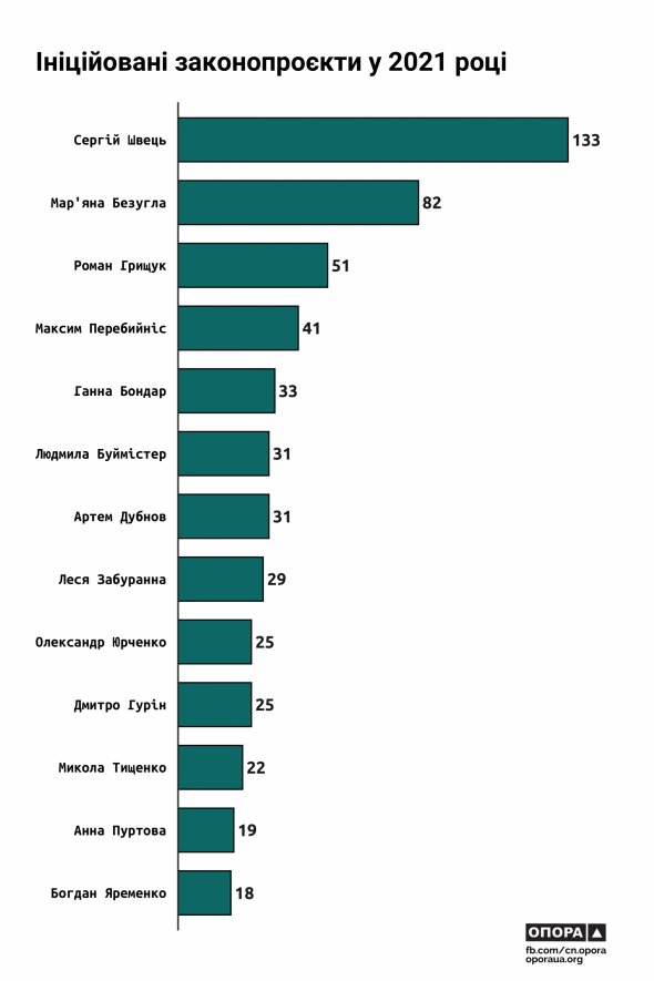 Найбільшу кількість законопроєктів запропонував Швець - 133, 12 із яких стали законами. Від Безуглої надійшло 82 законодавчих ініціатив, 18 підписав президент. Грищук - 51 проєкт законів, три з яких набули чинності.