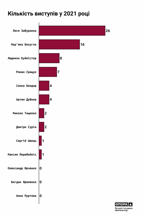 Найчастіше виступала Забуранна - 26 разів. Безугла скористалася своїм правом виступу 16 разів. Перебийніс і Швець - лише по одному.