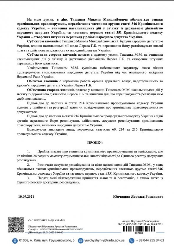 У тексті заяви вказані кілька статтей Кримінального кодексу України. За однією Тищенку може загрожувати арешт чи обмеження волі.