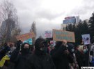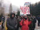 Люди тримають плакати "Імітація судової реформи", "Політв'язням - волю", фотографії ув'язнених громадського діяча Сергія Стерненка і ветерана російсько-української війни Андрія Антоненка, фото міністра Арсена Авакова з написом "Геть чорт".