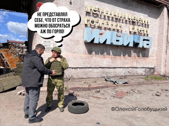 Тим часом кремлівський пропагандист, українофоб Володимир Соловйов сходив під себе в штани у Маріуполі, фотоколаж опублікував політтехнолог Олексій Голобуцький.