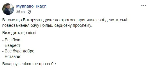 "Я вдячний Святославові Вакарчуку, що він очолив партію "Голос" і провів її в парламент. Так, я очікував, що у Верховній Раді Святослав довго не витримає й складе повноваження. Дивуюся, що він не зробив цього раніше, шкодую, що він робить це напередодні місцевих виборів. На мою думку, піти треба було або на самому початку, або вже після місцевих. Але тепер "Голос" очолює крута Кіра Рудик, я вірю в неї та продовжую лишатися другом і прихильником її партії.