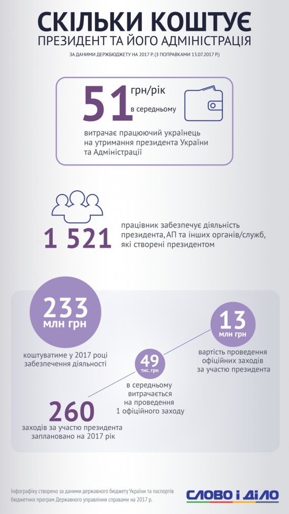 Загальна сума витрат на обслуговування президента та АП в 2017 році становить майже 819,9 млн грн. За даними Держстату, у першому півріччі кількість працюючих громадян у країні склала 16,12 млн осіб. Щороку на кожного з них припадає майже 51 гривня. На утримання Верховної Ради й депутатського корпусу - понад 70 грн.