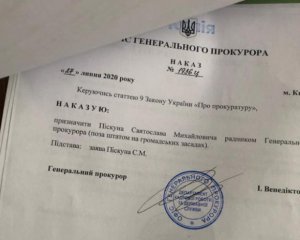 Луценко опублікував фото наказу Венедіктової від 27 липня. Піскуна призначили поза штатом на громадських засадах.