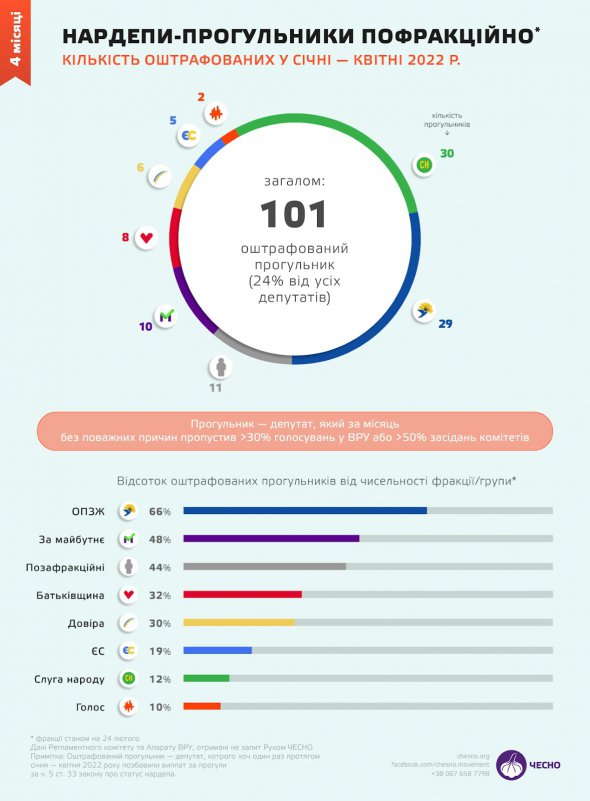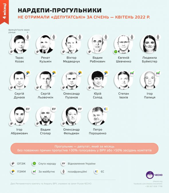 Більшість із них — ОПЗЖ. Також прогульники — колишні "слуги" Людмила Буймістер та Євгеній Шевченко, представники групи "Партія "За майбутнє", мажоритарники Ігор Палиця і Степан Івахів.