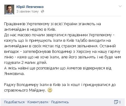 "До нас масово почали звертатися працівники Укртелекому - кажуть що їх примушують їхати в Київ та/або виходити на антимайдани в своїх містах під страхом звільнення", додав Левченко.
