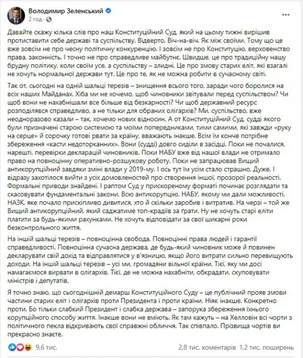 На думку Зеленського, "сьогоднішній демарш Конституційного Суду" є публічним проявом змови частини старих еліт і олігархів проти президента і проти країни. Метою змови є захист корупційного способу життя.