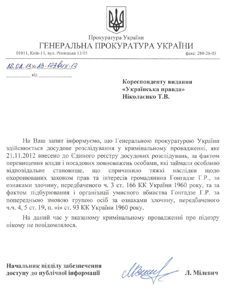 Водночас Генеральною прокуратурою здійснюється досудове розслідування у кримінальному провадженні, яке внесено 21.11.2012 внесено до Єдиного реєстру досудових розслідувань, "за фактом перевищення влади і посадових повноважень особами, які займали особливо відповідальне становище, що спричинило тяжкі наслідки щодо охоронюваних законом прав і інтересів громадянина Гонгадзе Г.Р".