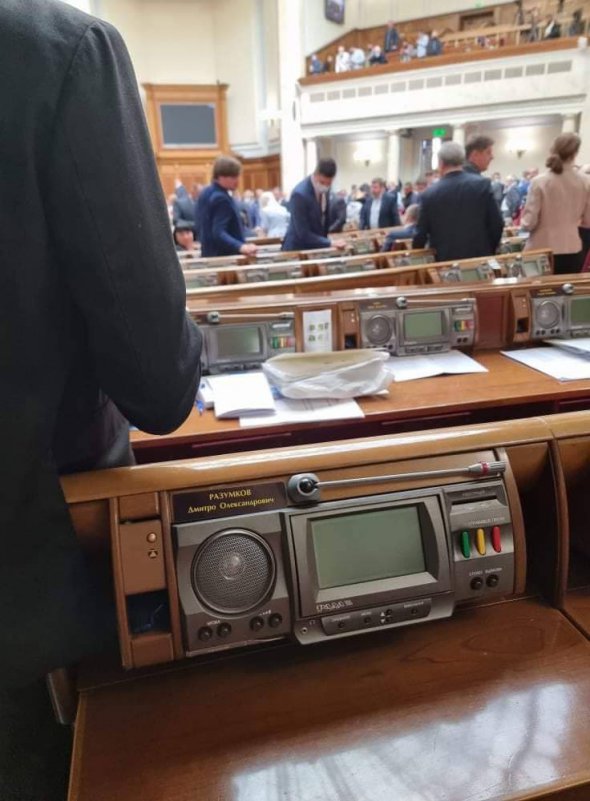 "Тепер робоче місце Дмитра Разумкова за фракцією "ЄС" на гальорці", - повідомив журналіст.