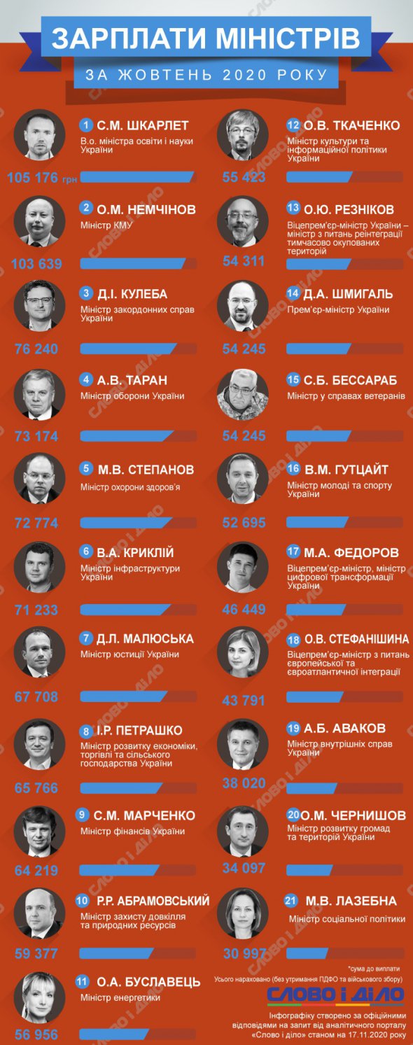 Найбільш високооплачуваним членом Кабінету міністрів у жовтні став виконувач обов'язків міністра освіти і науки Сергій Шкарлет. Йому нарахували 105 тис. 176 грн, включаючи відпускні та матеріальну допомогу на оздоровлення, повідомляє портал "Слово і діло"