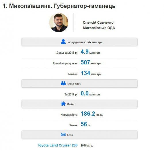 Найбагатшим, за декларацією, виявився очільник Миколаївщини Олексій Савченко. 2-ге місце посів очільник Чернігівщини Валерій Куліч. 3-тє - одеський губернатор Максим Степанов.