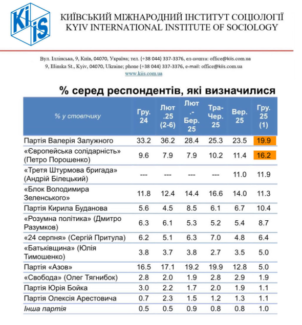 На запитання, за яку політичну силу у разі завершення війни готові голосувати українці, 19,9% серед тих, хто визначився, готові віддати голос за партію Валерія Залужного. Рік тому у грудні 2024-го партію Залужного підтримували 33,2%.