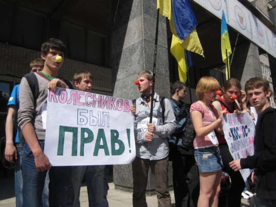 Гасла проти міністра заглушали гучними аплодисментами студенти Донецького національного університету, яких була більшість. Табачник віддав даровані йому квіти блондинкам з групи підтримки.