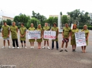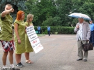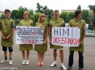 Хлопці і дівчата одягають на себе мішки і з плакатами стають обличчям до входу в раду. Депутати, що стоять при вході читають написи на плакатах, але швидко тікають до фойє, бо почався дощ.