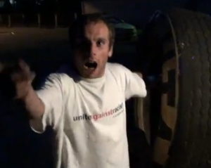 Цікаво, що будучи прикутим до вивіски, водій в яскравих фарбах розповів усе, що думає про українську міліцію.