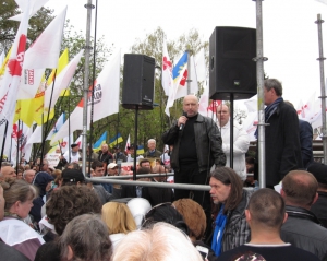 З трибуни продовжують виступати промовці, повідомляє кореспондент, - виступає Олександр Турчинов. З іншого боку, протесттуючих, чи то працівників Барабашова, чи то харківян, чи то найманців Януковича, лунає музика.