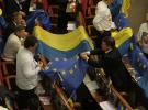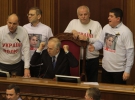 Народні депутати від "Батьківщини" розгортають у сесійній залі парламенту метрові прапори України. Розвішують їх на свої робочі місця. Поруч — прапори Євросоюзу. Так у п'ятницю вранці зустрічають уряд. Прем'єр Микола Азаров заходить через двері президії разом із спікером Володимиром Рибаком та його заступниками. Складає руки у замок над головою, так махає присутнім. Йде на своє місце в урядову ложу. Тут розсідаються на місця міністри.