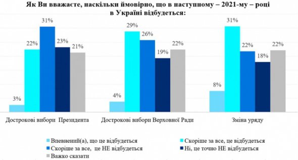 "25 відсотків вважають, що 2021 року можливі дострокові вибори президента, 33 відсотки вважають можливими дострокові вибори Верховної Ради, 39 відсотків - що ймовірною є зміна уряду протягом 2021-го".