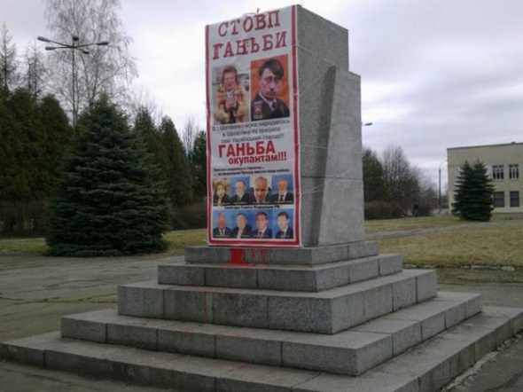 У Хмельницькій області мешканці райцентру Шепетівка перетворили постамент знесеного в ніч на 7 лютого пам'ятника Леніну в стовп ганьби президента РФ Володимира Путіна, Валентини Матвієнко і російських сенаторів - уродженців України, що дозволили Путіну ввести війська на територію своєї батьківщини.