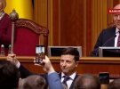 У Верховну Раду внесли штандарт президента України. Після цього Зеленський зайняв офіційне місце президента у Верховній Раді. Там він підписав присягу. Йому аплодував зал.