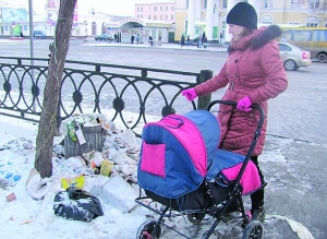 Полтавка 25-річна Ірина Крампе гуляє з сином 1-місячним Артемом у сквері біля Південного вокзалу. Показує на купи сміття.