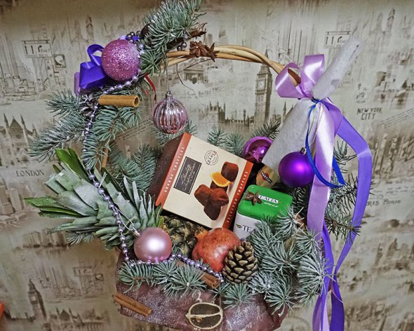 Декорують новорічні кошики продуктів шишками, гілочками і стрічками. Крім алкогольних напоїв в чоловічий варіант додають цукерки, ананас або манго.